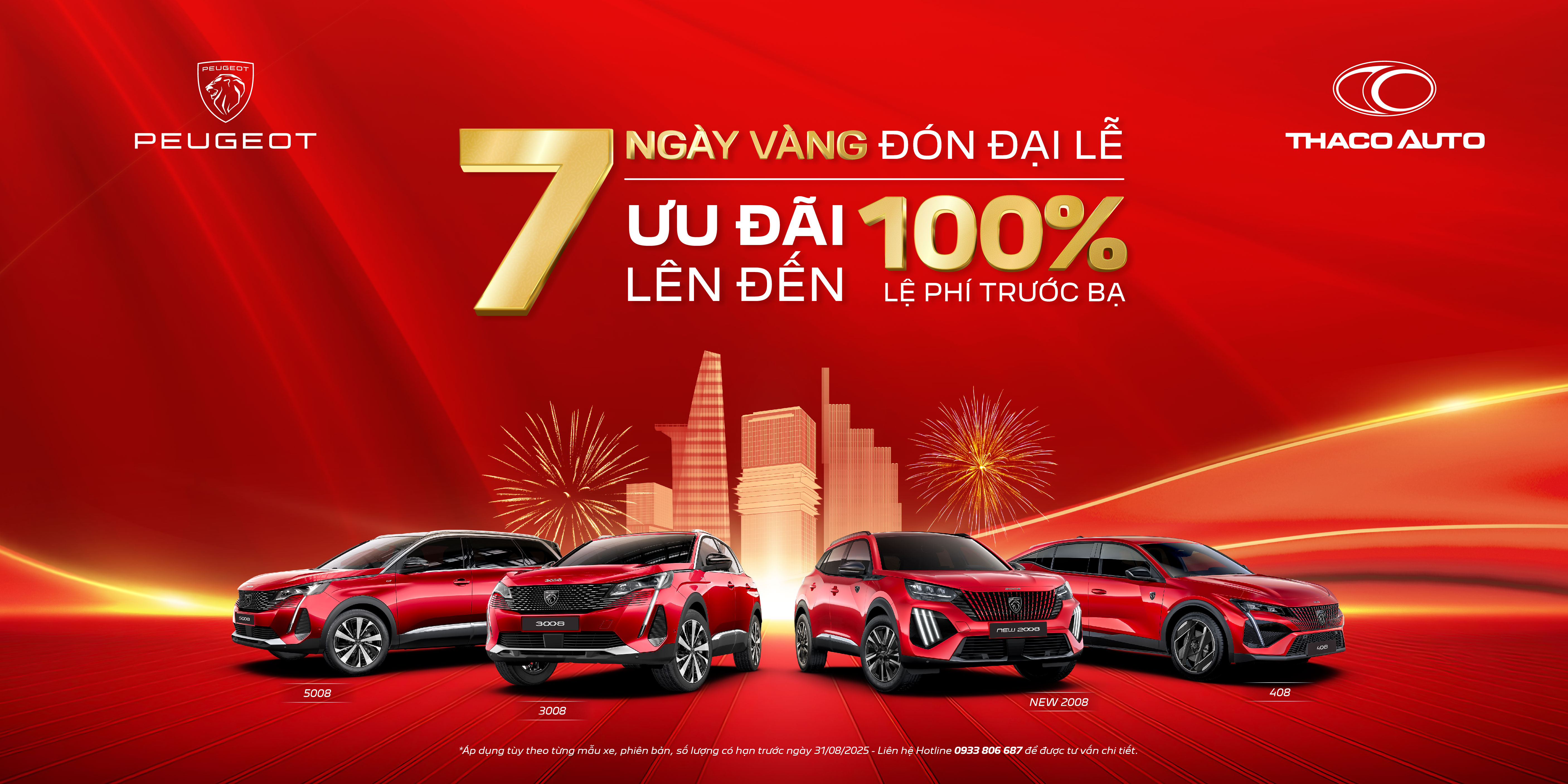 Nhân dịp đại lễ 2/9, Peugeot triển khai chương trình 7 ngày vàng đón đại lễ nhằm mang đến cho các Quý khách hàng cơ hội sở hữu những mẫu xe Peugeot cuốn hút với ưu đãi hấp dẫn.