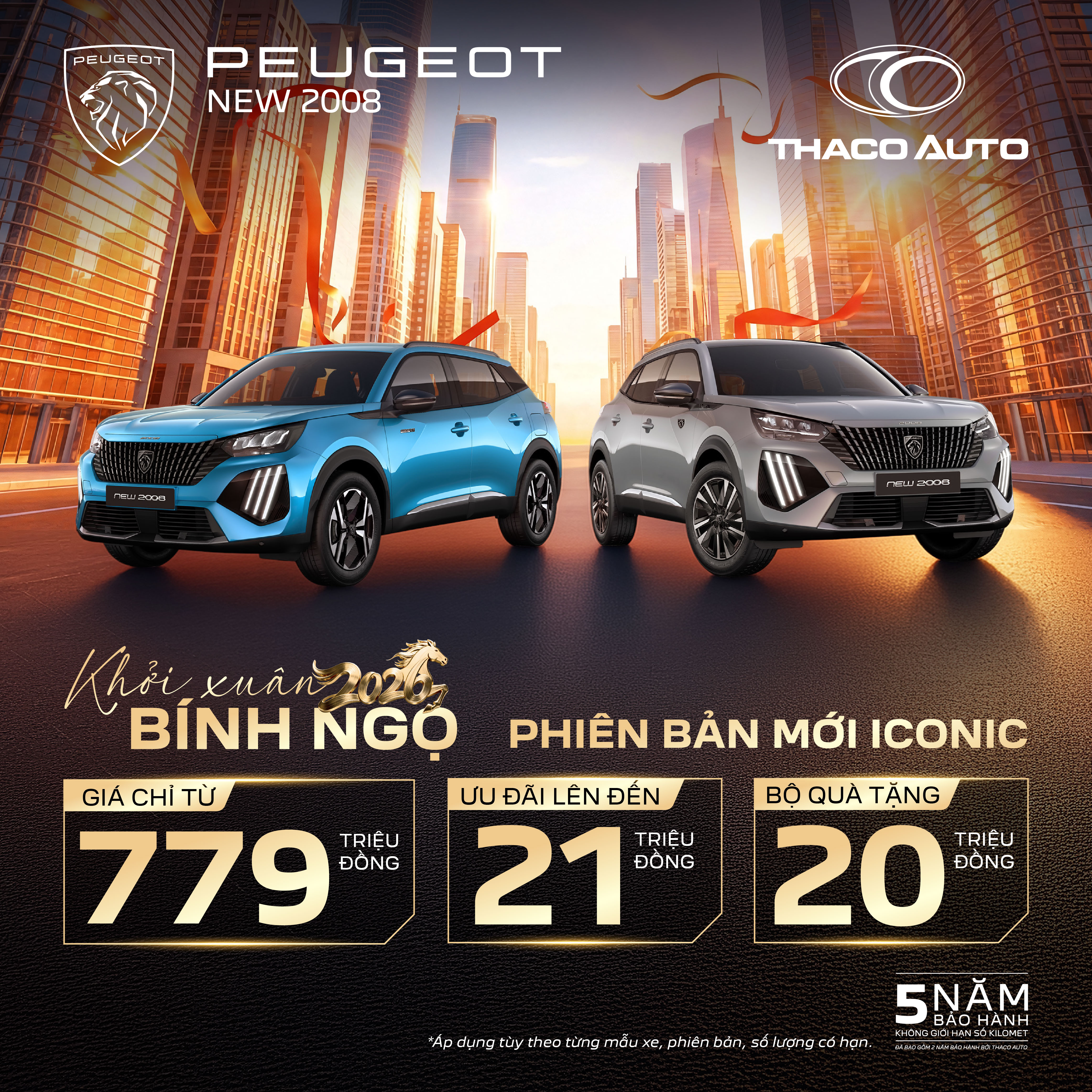 New Peugeot 2008 ICONIC – phiên bản đặc biệt mới ra mắt – được định vị là mẫu SUV đô thị châu Âu hiện đại, nơi thiết kế, công nghệ và cá tính hội tụ. Phiên bản ICONIC sở hữu ngôn ngữ thiết kế sắc sảo, khoang lái Peugeot i-Cockpit® trực quan, động cơ Turbo PureTech mạnh mẽ, nền tảng khung gầm CMP danh tiếng cùng các hệ thống hỗ trợ lái tiên tiến, mang đến trải nghiệm vận hành linh hoạt và an tâm trong đô thị. Dấu ấn ICONIC được nhấn mạnh qua các chi tiết nhận diện riêng như logo “ICONIC” độc quyền hai bên thân và phía sau xe, logo “2008” màu xám Basalt, cản trước ốp xám Meteor. Khách hàng có thể lựa chọn nhiều màu ngoại thất, nổi bật là Xanh Obsession Blue đổi sắc theo góc nhìn, cùng tùy chọn ghế da nâu cao cấp sang trọng. Dịp Xuân Bính Ngọ, New Peugeot có giá từ 779 triệu đồng, kèm ưu đãi trị giá 21 triệu đồng – lựa chọn phù hợp cho người trẻ cá tính, người mua xe lần đầu hoặc mong muốn nâng cấp lên SUV.
