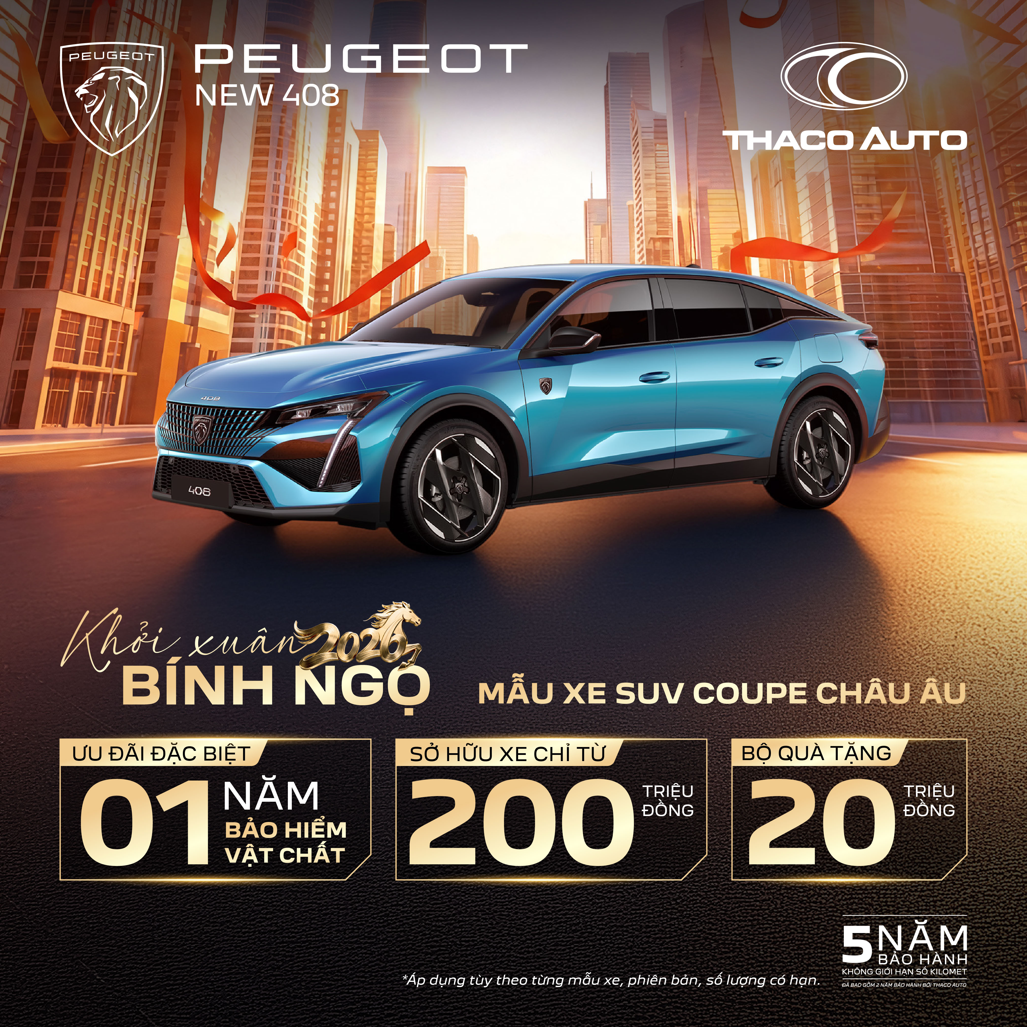 Dành cho những khách hàng đề cao dấu ấn cá nhân, New Peugeot 408 mang đến cảm giác lái đậm chất thể thao với động cơ 1.6L Turbo PureTech, hộp số tự động 8 cấp và khả năng tăng tốc 0–100 km/h trong 8,8 giây, sẵn sàng khơi dậy cảm hứng trên mọi cung đường. Mức giá từ 999 triệu đồng, ưu đãi 1 năm bảo hiểm vật chất, chi phí trả trước từ 200 triệu đồng giúp việc sở hữu trở nên dễ dàng hơn bao giờ hết. Đặc biệt, New Peugeot 408 Legend Edition – phiên bản kỷ niệm 215 năm thương hiệu, giới hạn 215 chiếc – nổi bật với màu Xám Selenium độc quyền, nội thất ghế da nâu sang trọng, logo kỷ niệm trên tựa đầu ghế cùng bộ quà tặng sưu tầm riêng biệt. Một lựa chọn dành cho những ai tìm kiếm giá trị khác biệt và tính sưu tầm hiếm có.