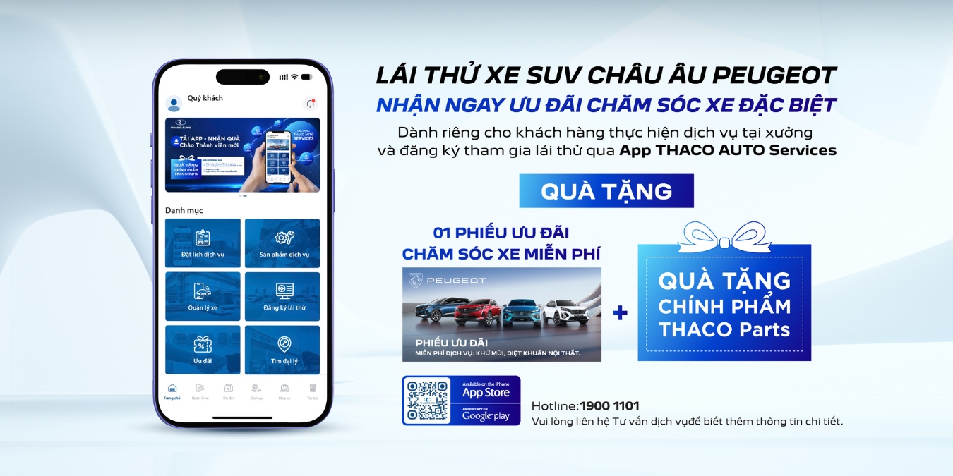 Nhằm mang đến trải nghiệm đồng hành trọn vẹn cho khách hàng, Peugeot triển khai chương trình ưu đãi đặc biệt dành riêng cho khách hàng đang sử dụng dịch vụ, phụ tùng chính hãng Peugeot tại hệ thống đại lý trên toàn quốc và đăng ký lái thử xe thông qua ứng dụng THACO AUTO Services. Chương trình kết nối trải nghiệm lái thử các dòng SUV châu Âu Peugeot cùng dịch vụ chăm sóc xe chính hãng, giúp khách hàng cảm nhận trọn vẹn giá trị sản phẩm và dịch vụ trong suốt hành trình sử dụng xe.