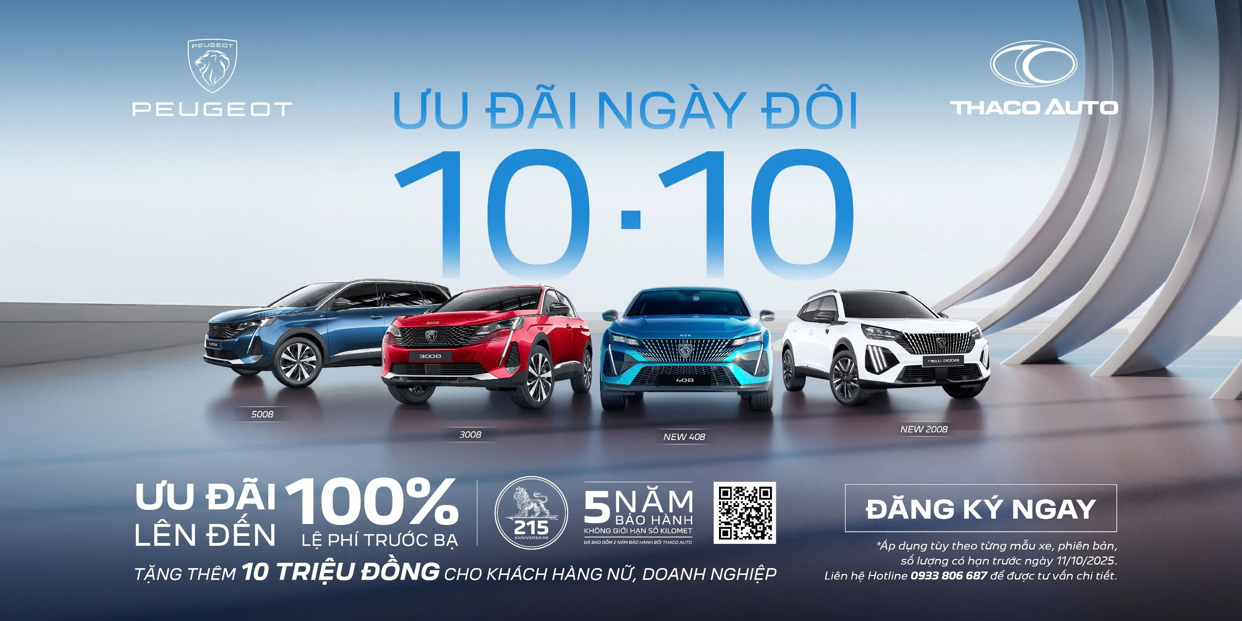 Bùng nổ ngày đôi 10/10, Peugeot mang đến chương trình ưu đãi đặc biệt từ 07 - 11/10/2025. Đây cơ hội vàng để sở hữu các mẫu xe Pháp cuốn hút và mở ra những hành trình mới đầy cảm xúc.