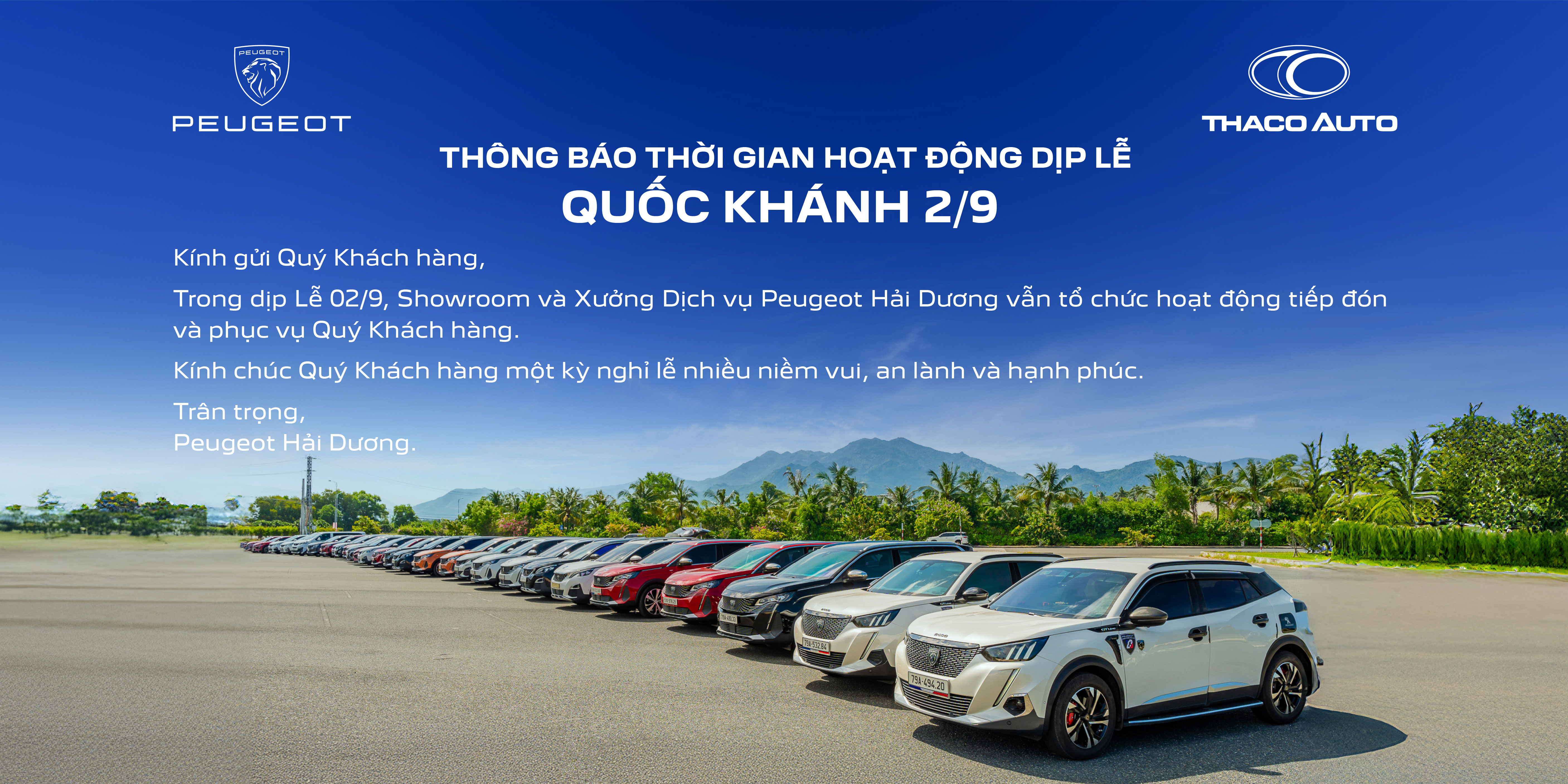 Trong dịp Lễ 02/9, hệ thống Showroom và Xưởng Dịch vụ Peugeot Hải Dương vẫn tổ chức hoạt động tiếp đón và phục vụ Quý Khách hàng.